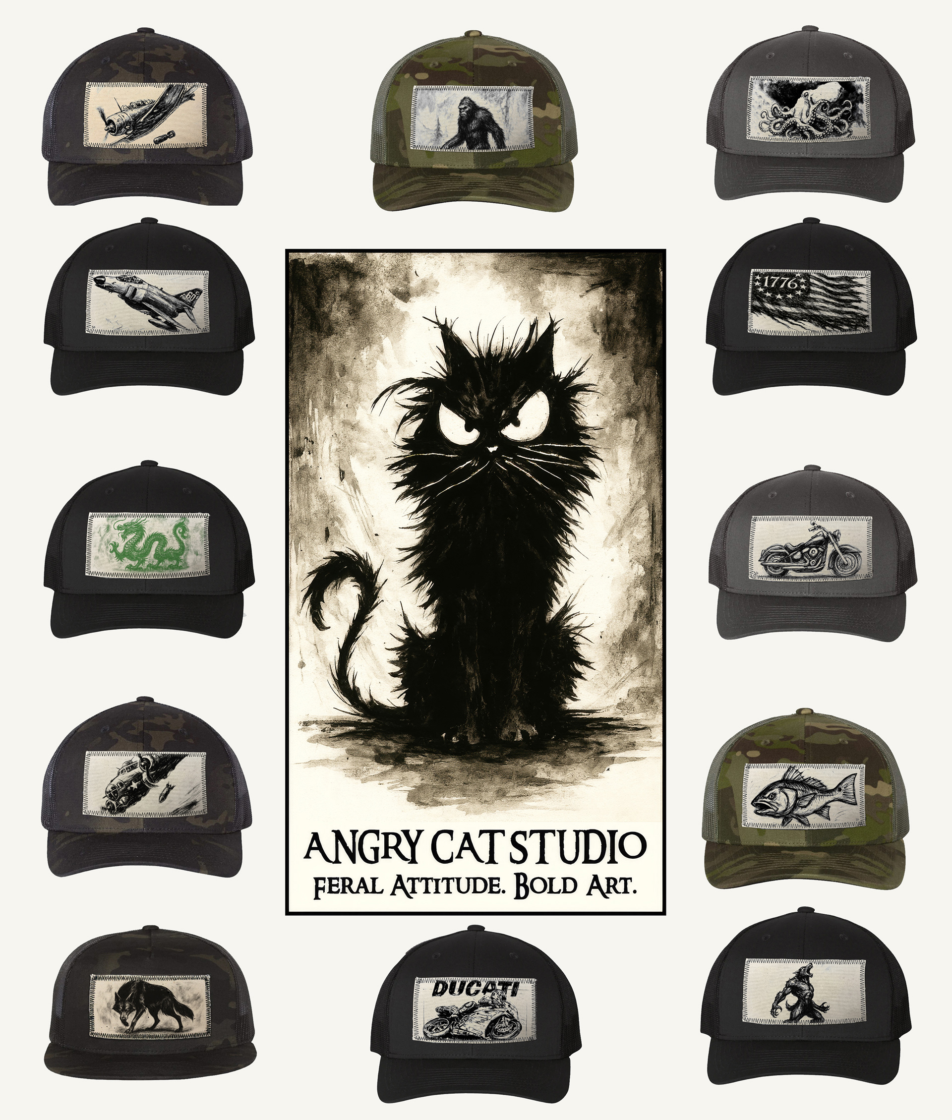 Angry Cat Studio is a Savannah, GA homegrown shop turning original artwork into canvas patches on custom hats. Each design is created in‑house, printed on canvas, hand‑cut, and assembled one at a time — made to order with no wasted stock.
